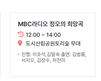| 12:00 ~ 14:00 | 도시산림공원토리숲 무대 | MBC라디오 정오의 희망곡 | |