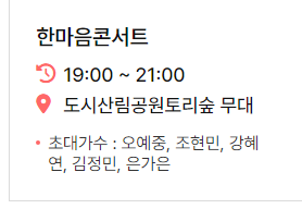| 19:00 ~ 21:00 | 도시산림공원토리숲 무대 | 한마음콘서트 | |