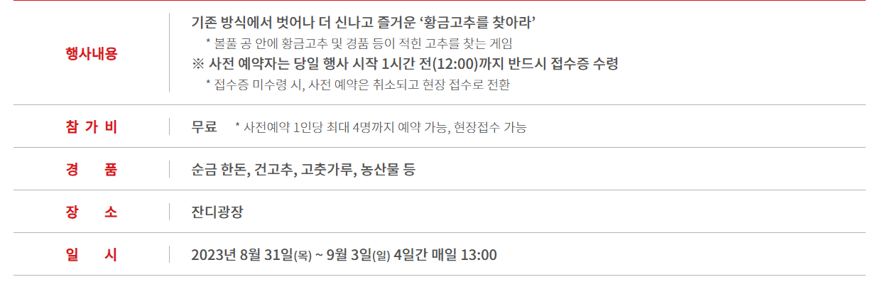 괴산 고추축제는 고추의 풍성한 수확과 지역 사회의 열정을 축하하며 참가자들에게 즐거운 경험을 제공하는 대표적인 지역 축제입니다. 고추를 중심으로 한 다양한 이벤트와 볼거리, 문화 행사, 지속 가능한 운영 방식 등이 이 축제의 매력을 더욱 풍부하게 만들어줍니다. 괴산 고추축제는 고추의 매콤한 맛뿐만 아니라 지역의 따뜻한 정을 느낄 수 있는 특별한 장소로, 많은 이들에게 추천할 만한 가치 있는 행사입니다.