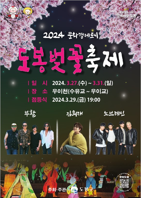 서울시 도붕구에서 도봉벚꽃축제가 열립니다. 인기 있는 가수들 공연과 체험 프로그램들이 있으니 가족이나 연인들이 즐기기에 좋은 벚꽃축제입니다.